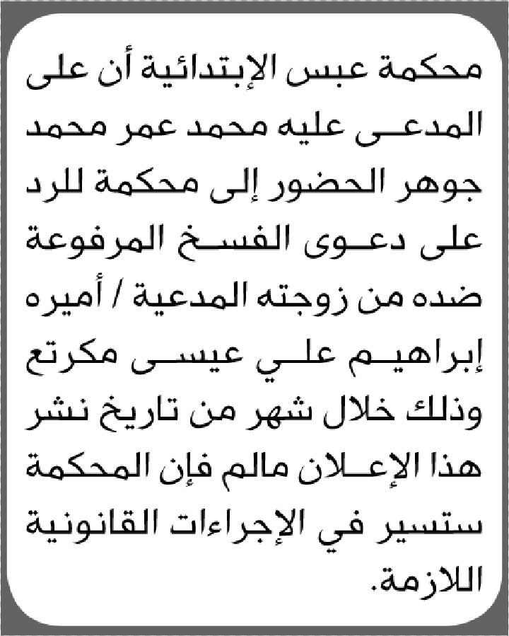 تعلن محكمة عبس الابتدائية بأن على/ محمد عمر جوهر الحضور إلى المحكمة إعلاناتمحاكم On ديسمبر 7, 2025 Share Share FacebookTwitterWhatsAppTelegramGoogle+البريد الإلكترونيPrint