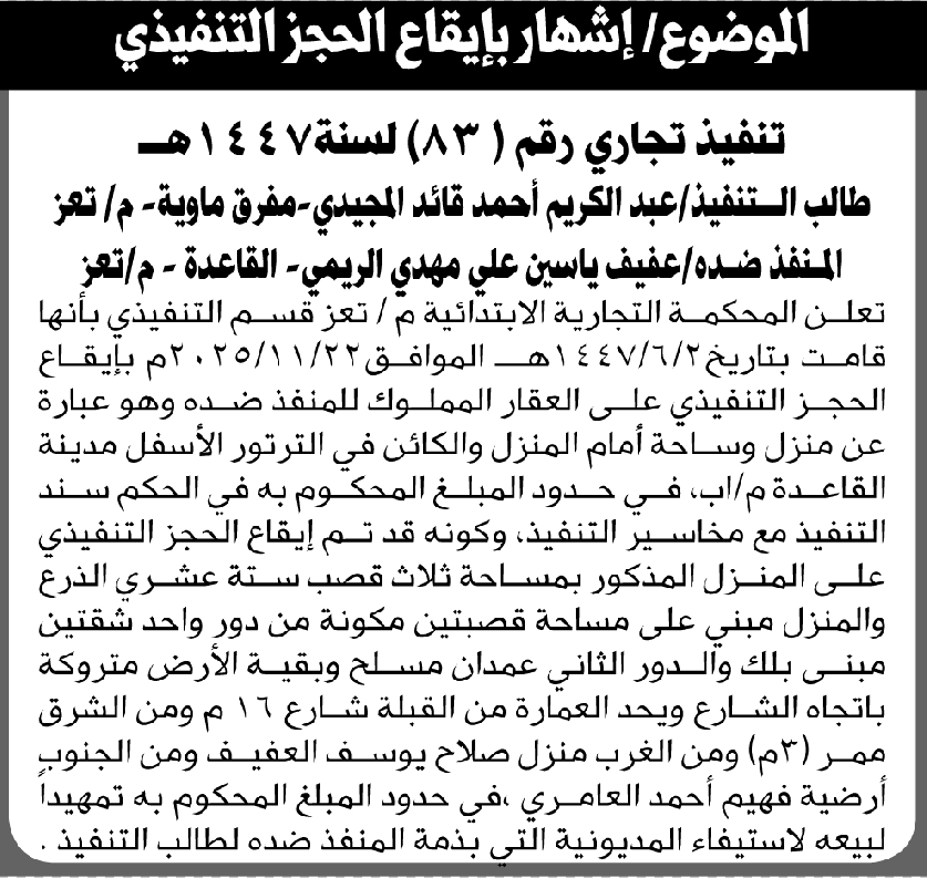 تعلن المحكمة التجارية بـتعز عن الحجز التنفيذي للعقار التابع للمنفذ ضده عفيف ياسين الريمي إعلاناتمحاكم On ديسمبر 8, 2025 Share Share FacebookTwitterWhatsAppTelegramGoogle+البريد الإلكترونيPrint