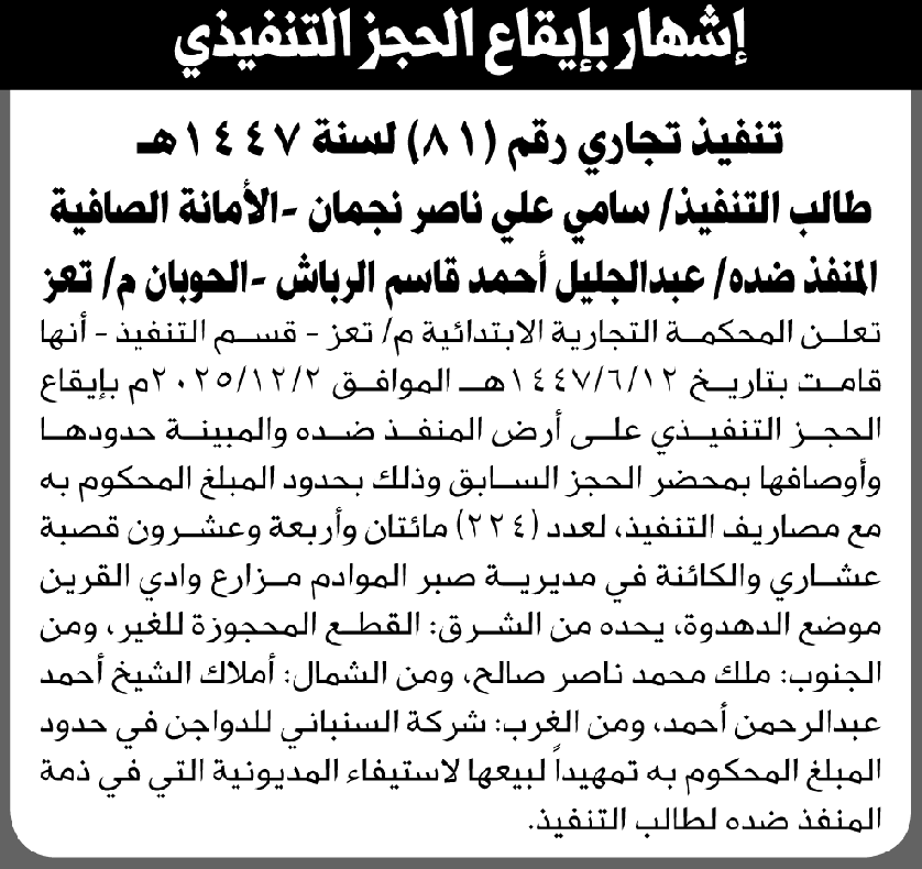 تعلن المحكمة التجارية بـتعز عن حجز الأرض التابعة للمنفذ ضده عبدالجليل أحمد الرباش إعلاناتمحاكم On ديسمبر 8, 2025 Share Share FacebookTwitterWhatsAppTelegramGoogle+البريد الإلكترونيPrint
