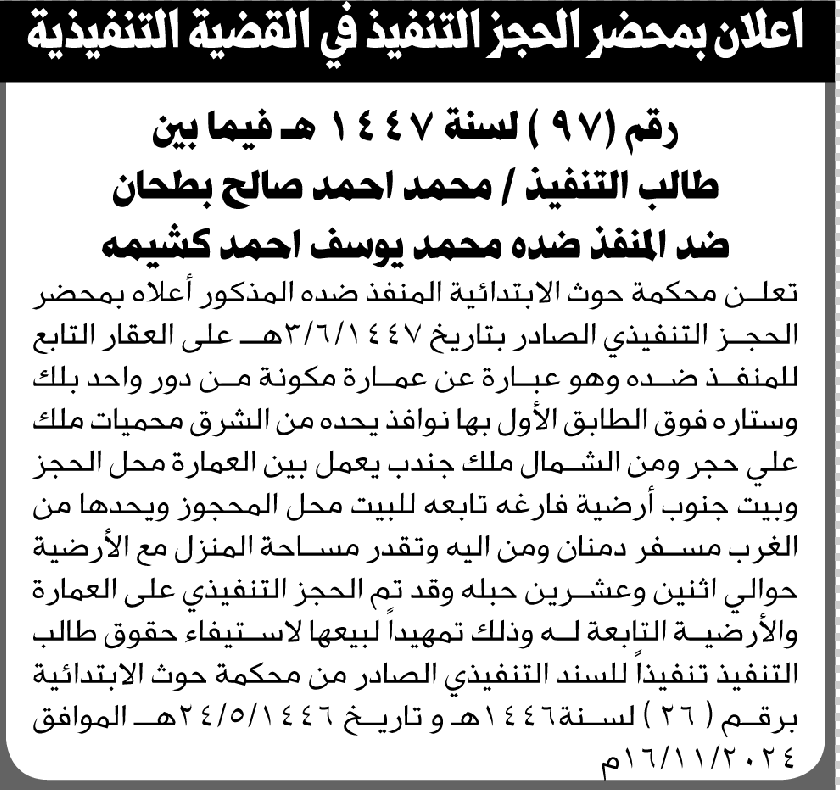 تعلن محكمة حوث للمنفذ ضده محمد يوسف كشيمه عن أمر الحجز التنفيذي إعلاناتمحاكم On ديسمبر 8, 2025 Share Share FacebookTwitterWhatsAppTelegramGoogle+البريد الإلكترونيPrint