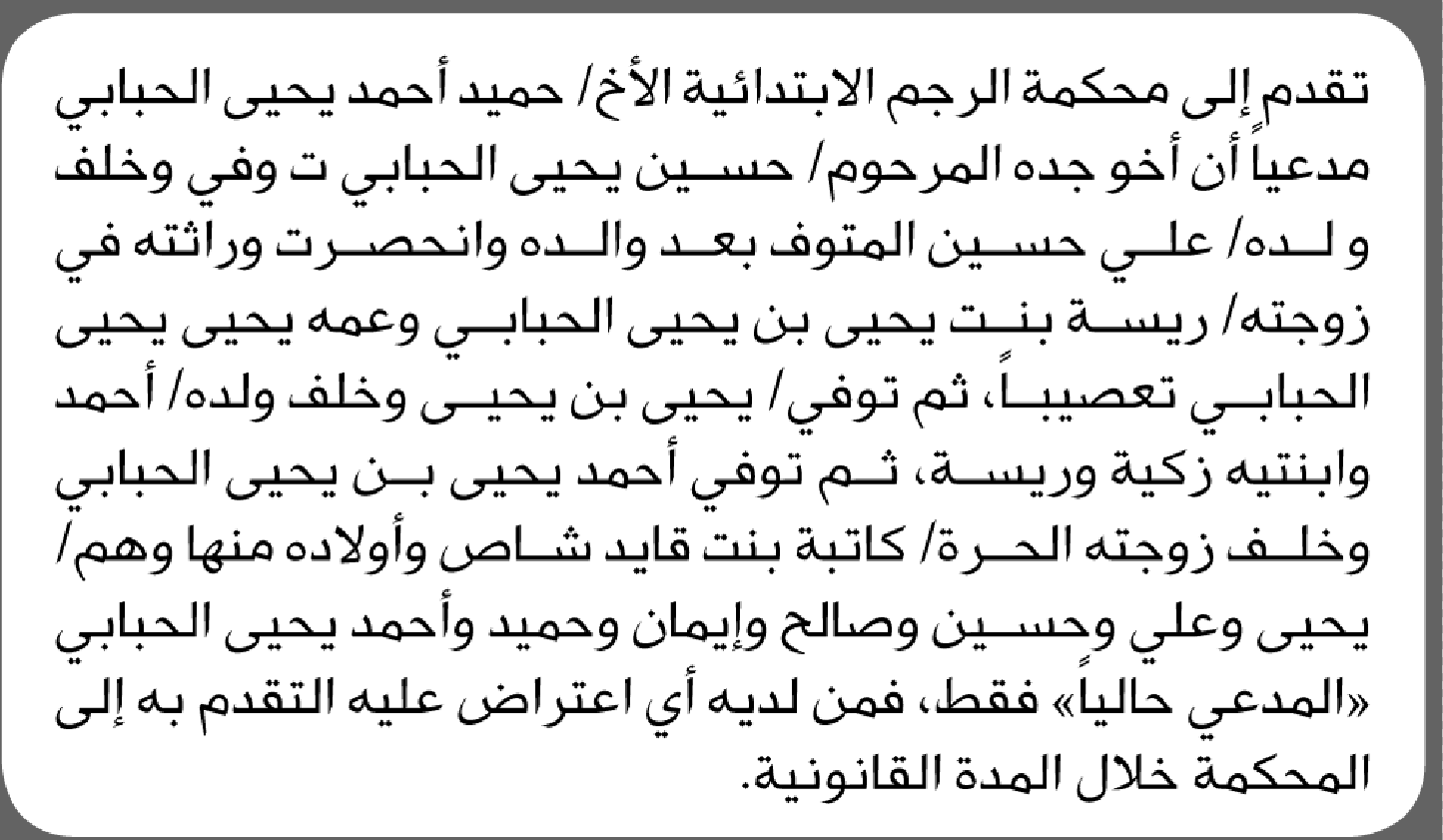 تعلن محكمة الرجم الابتدائية بأن الأخ/ حميد أحمد الحبابي تقدم إليها بطلب انحصار وراثة إعلاناتمحاكم On ديسمبر 8, 2025 Share Share FacebookTwitterWhatsAppTelegramGoogle+البريد الإلكترونيPrint