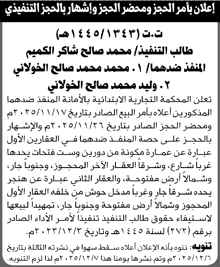 تعلن المحكمة التجارية الابتدائية بأمر الحجز التنفيذي لعقار المنفذ ضدهم/ محمد ووليد الخولاني إعلاناتمحاكم On ديسمبر 8, 2025 Share Share FacebookTwitterWhatsAppTelegramGoogle+البريد الإلكترونيPrint