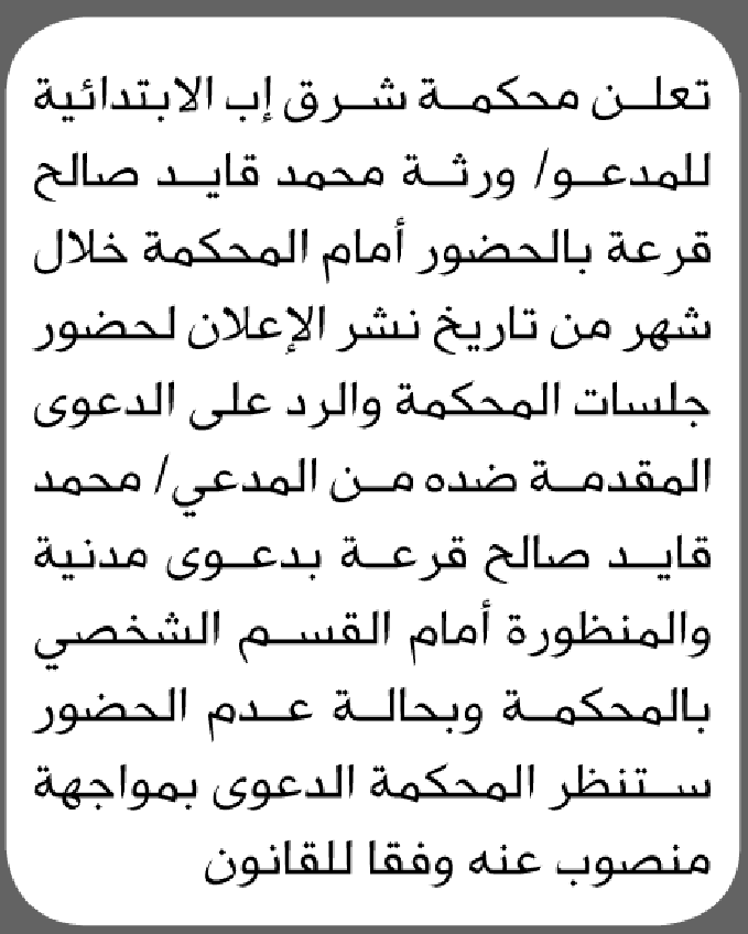 تعلن محكمة شرق إب الابتدائية بأن على/ ورثة محمد قايد قرعة الحضور إلى المحكمة إعلاناتمحاكم On ديسمبر 8, 2025 Share Share FacebookTwitterWhatsAppTelegramGoogle+البريد الإلكترونيPrint