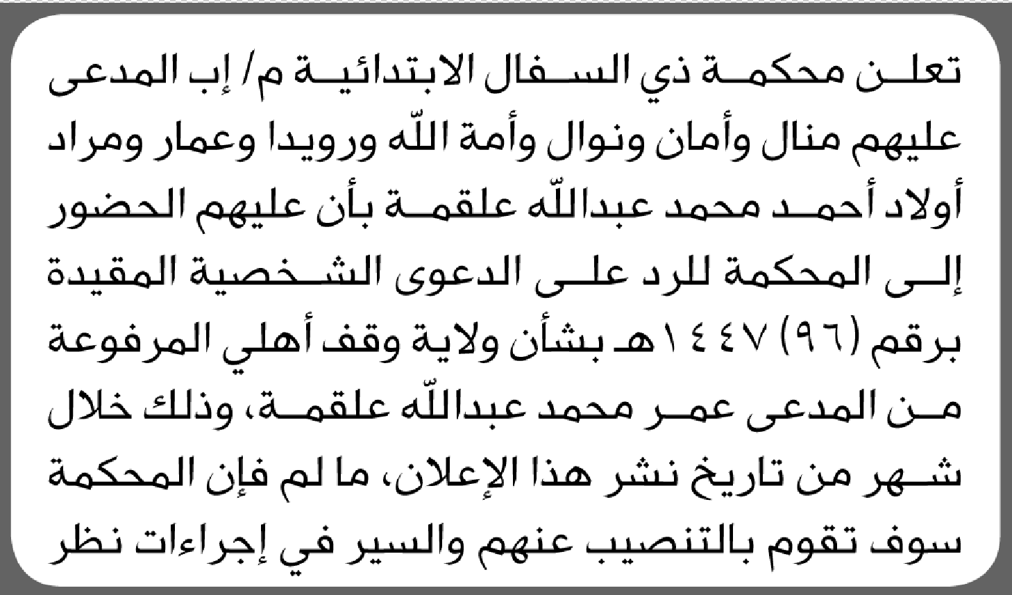 تعلن محكمة ذي السفال الابتدائية بأن على/ منال أحمد علقمة وأخرين الحضور إلى المحكمة إعلاناتمحاكم On ديسمبر 8, 2025 Share Share FacebookTwitterWhatsAppTelegramGoogle+البريد الإلكترونيPrint