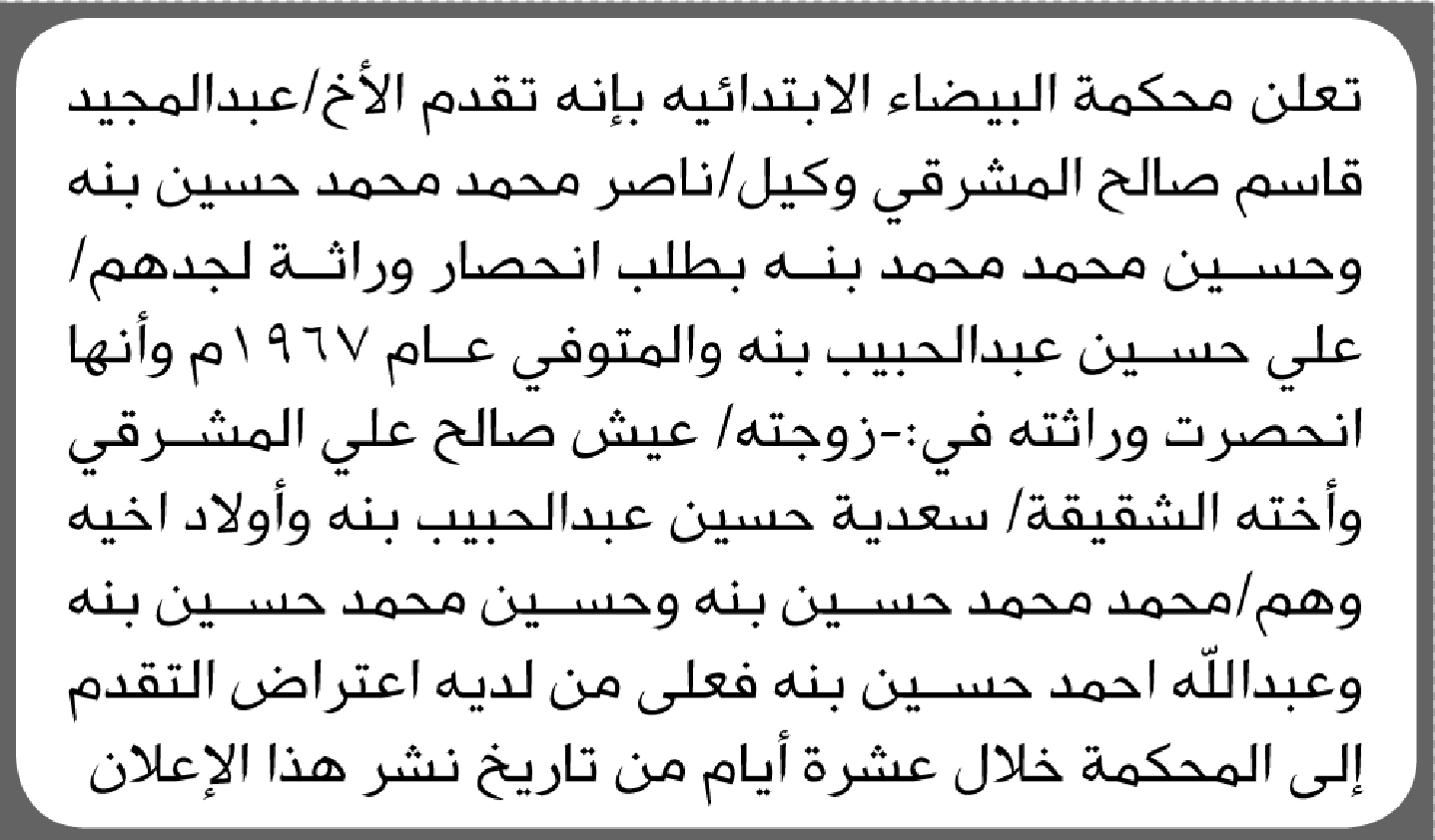 تعلن محكمة البيضاء بأنه تقدم إليها عبدالمجيد المشرقي بطلب إنحصار وراثة إعلاناتمحاكم On ديسمبر 9, 2025 Share Share FacebookTwitterWhatsAppTelegramGoogle+البريد الإلكترونيPrint