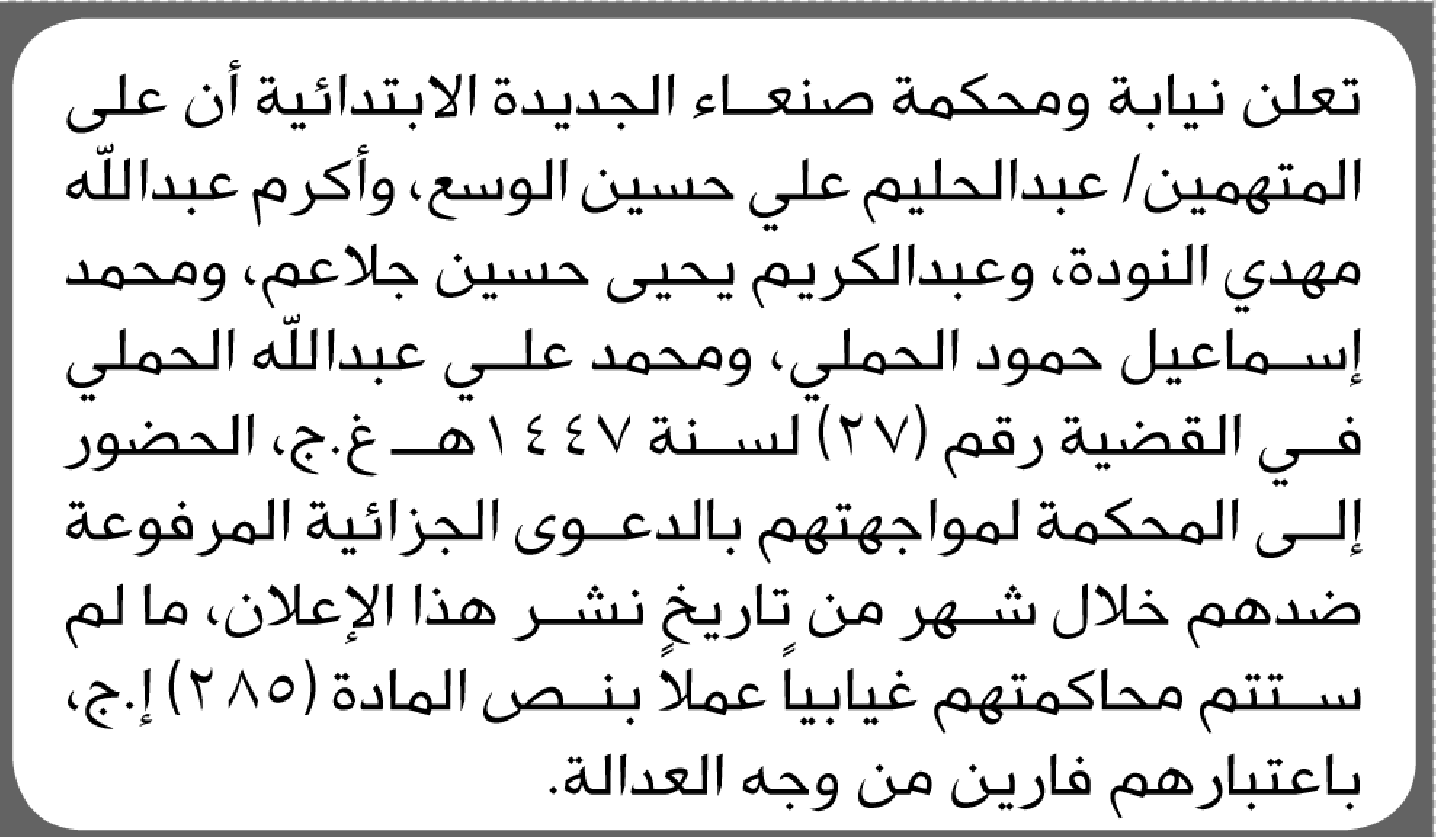 تعلن محكمة صنعاء الجديده أن على المتهمين الحضور الى المحكمة إعلاناتمحاكم On ديسمبر 10, 2025 Share Share FacebookTwitterWhatsAppTelegramGoogle+البريد الإلكترونيPrint