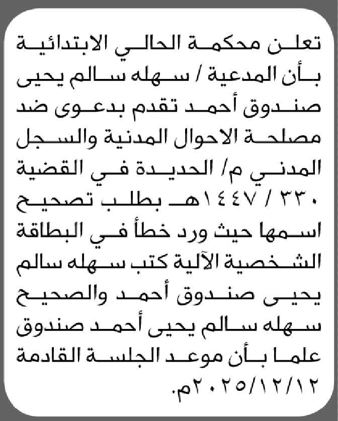 تعلن محكمة الحالي أن المدعية سهله سالم تقدمت بطلب تصحيح إسم إعلاناتمحاكم On ديسمبر 10, 2025 Share Share FacebookTwitterWhatsAppTelegramGoogle+البريد الإلكترونيPrint