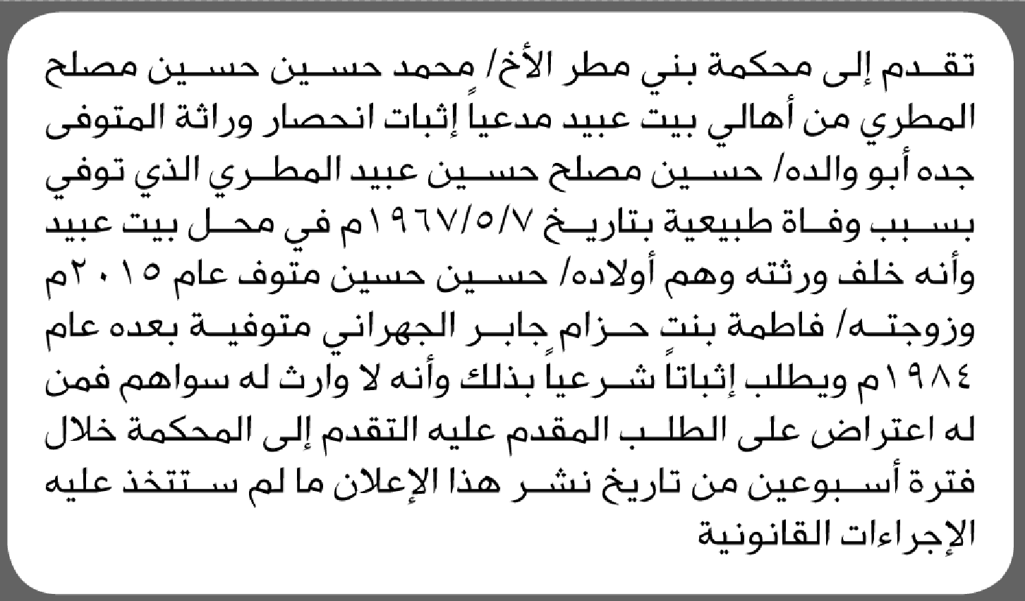 تقدم الى محكمة بني مطر محمد المطري بطلب انحصار وراثة إعلاناتمحاكم On ديسمبر 11, 2025 Share Share FacebookTwitterWhatsAppTelegramGoogle+البريد الإلكترونيPrint