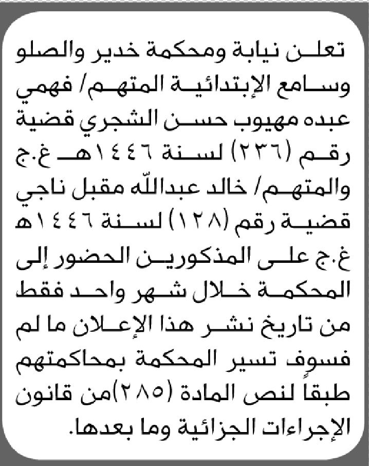 تعلن محكمة خدير والصلو وسامع الابتدائية بأن على/ فهمي عبده الشجري الحضور إلى المحكمة إعلاناتمحاكم On ديسمبر 11, 2025 Share Share FacebookTwitterWhatsAppTelegramGoogle+البريد الإلكترونيPrint
