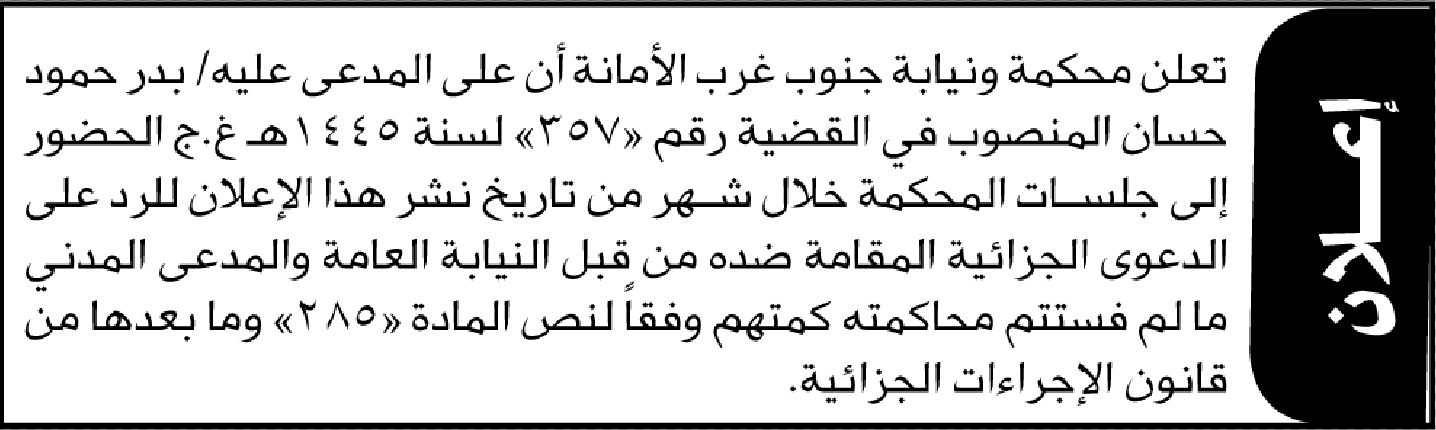 تعلن محكمة حنوب غرب الأمانه بأن على المدعى عليه بدر المنصوب الحضور الى المحكمة إعلاناتمحاكم On ديسمبر 12, 2025 Share Share FacebookTwitterWhatsAppTelegramGoogle+البريد الإلكترونيPrint