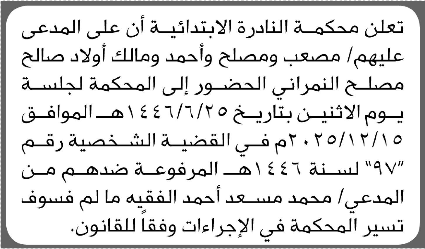 تعلن محكمة النادرة أن على المدعى عليهم أولاد صالح النمراني الحضور إلى المحكمة إعلاناتمحاكم On ديسمبر 13, 2025 Share Share FacebookTwitterWhatsAppTelegramGoogle+البريد الإلكترونيPrint