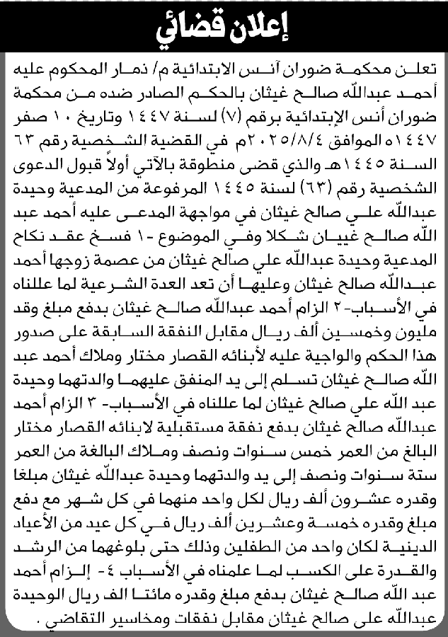 تعلن محكمة ضوران آنس للمحكوم عليه أحمد عبدالله غيثان بالحكم الصادر إعلاناتمحاكم On ديسمبر 13, 2025 Share Share FacebookTwitterWhatsAppTelegramGoogle+البريد الإلكترونيPrint