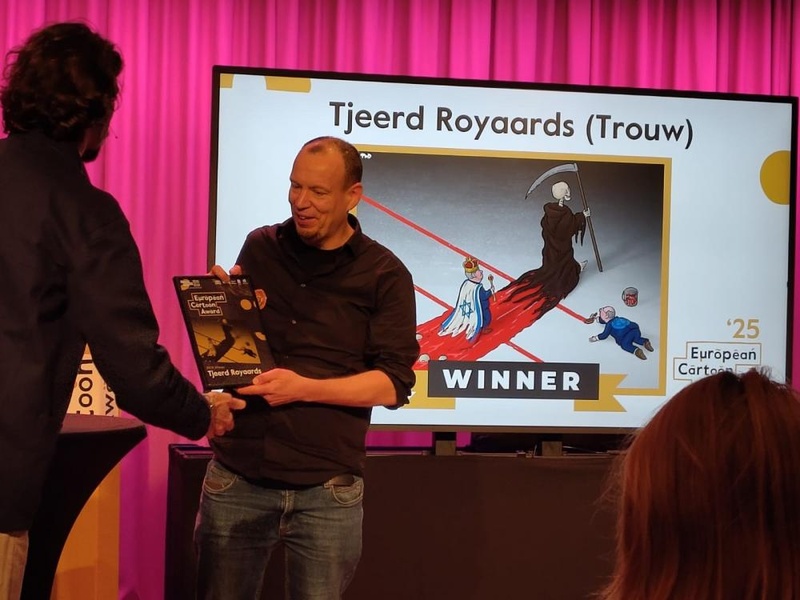 توج رسام الكاريكاتير الهولندي جيرد روياردز، بجائرة أفضل كاريكاتير في أوروبا لعام 2025، أدان فيها الإبادة التي تعرض لها الفلسطينيون على يد العدو الإسرائيلي.