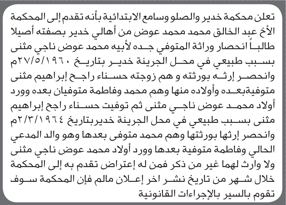 تعلن محكمة خدير والصلو وسامع أنه تقدم اليها عبدالخالق عوض بطلب إنحصار وراثة إعلاناتمحاكم On ديسمبر 14, 2025 Share Share FacebookTwitterWhatsAppTelegramGoogle+البريد الإلكترونيPrint