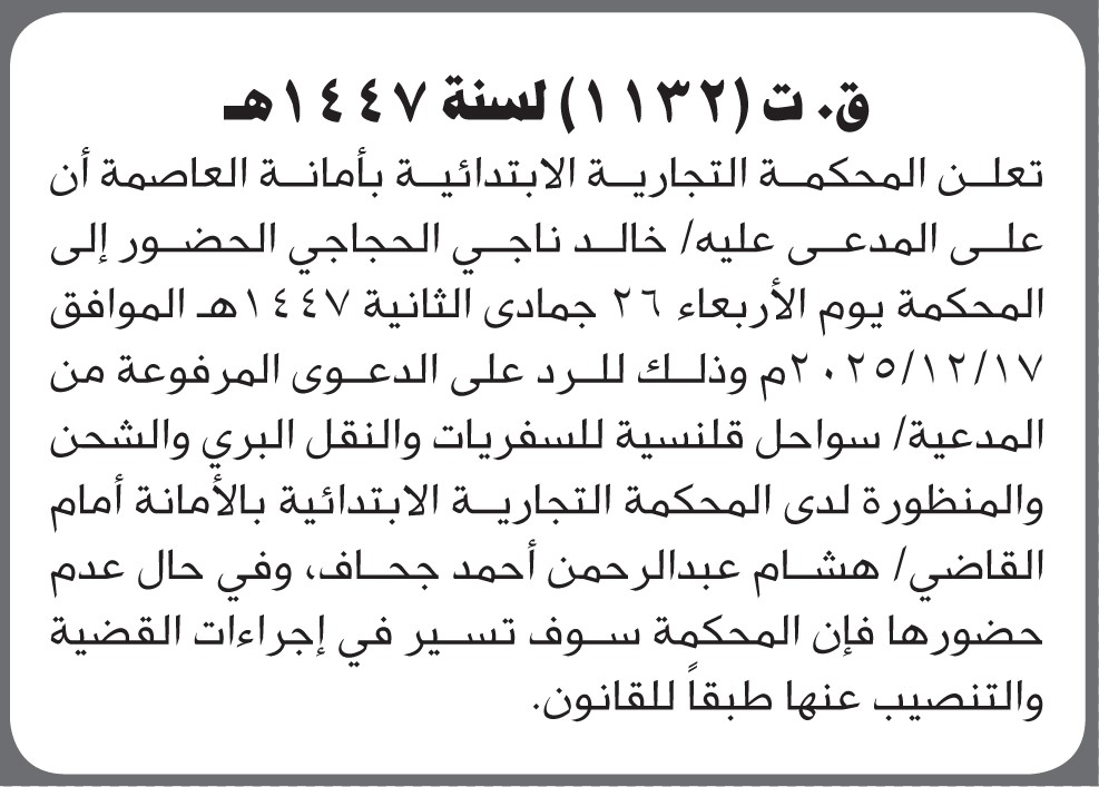 تعلن المحكمة التجارية بالأمانة أن على المدعي عليه خالد الحجاجي الحضور الى المحكمة إعلاناتمحاكم On ديسمبر 14, 2025 Share Share FacebookTwitterWhatsAppTelegramGoogle+البريد الإلكترونيPrint