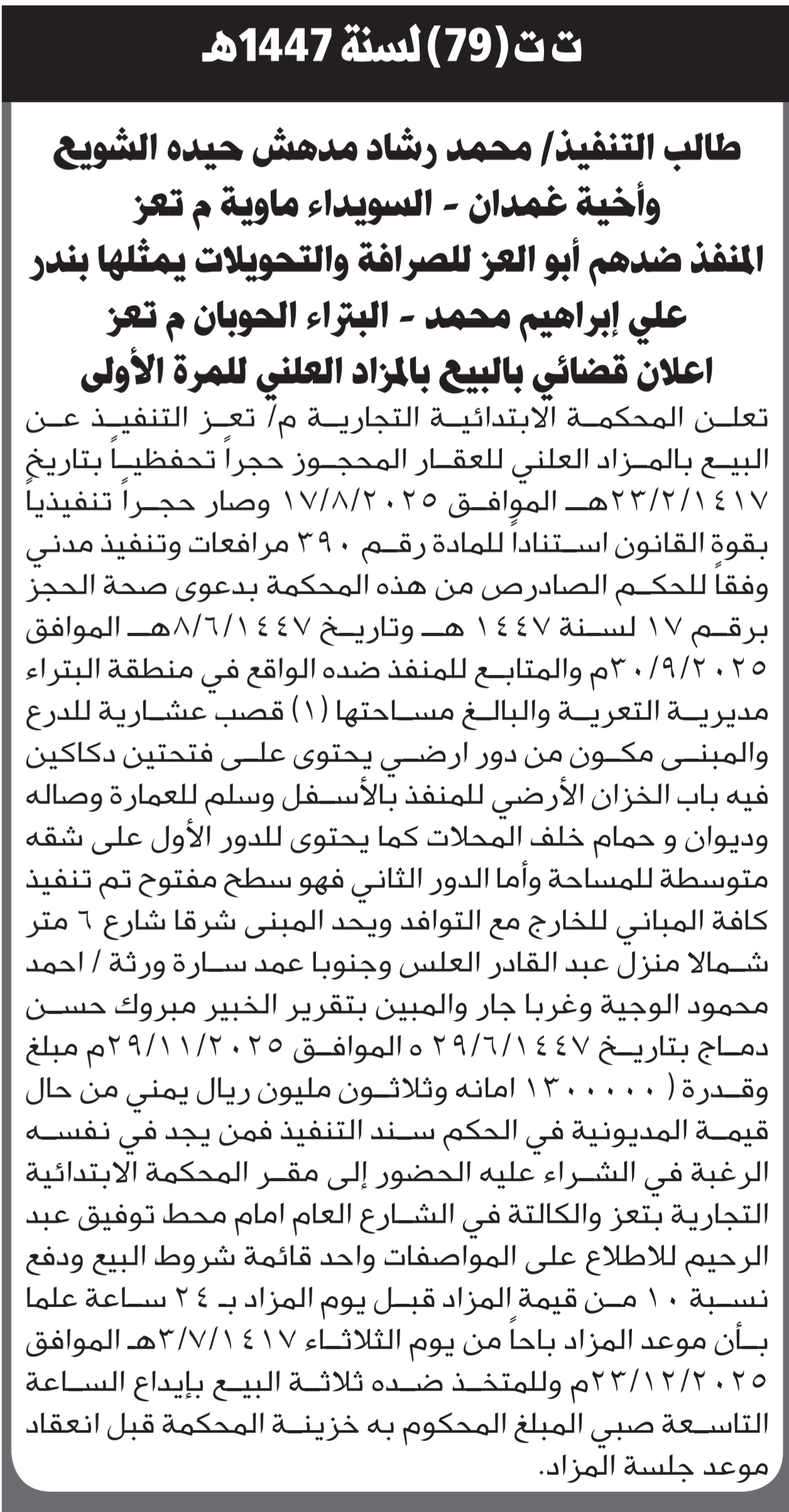 تعلن المحكمة التجارية بـ تعز عن بيع العقار التابع للمنفذ ضدها أبو العز للصرافة إعلاناتمحاكم On ديسمبر 15, 2025 Share Share FacebookTwitterWhatsAppTelegramGoogle+البريد الإلكترونيPrint