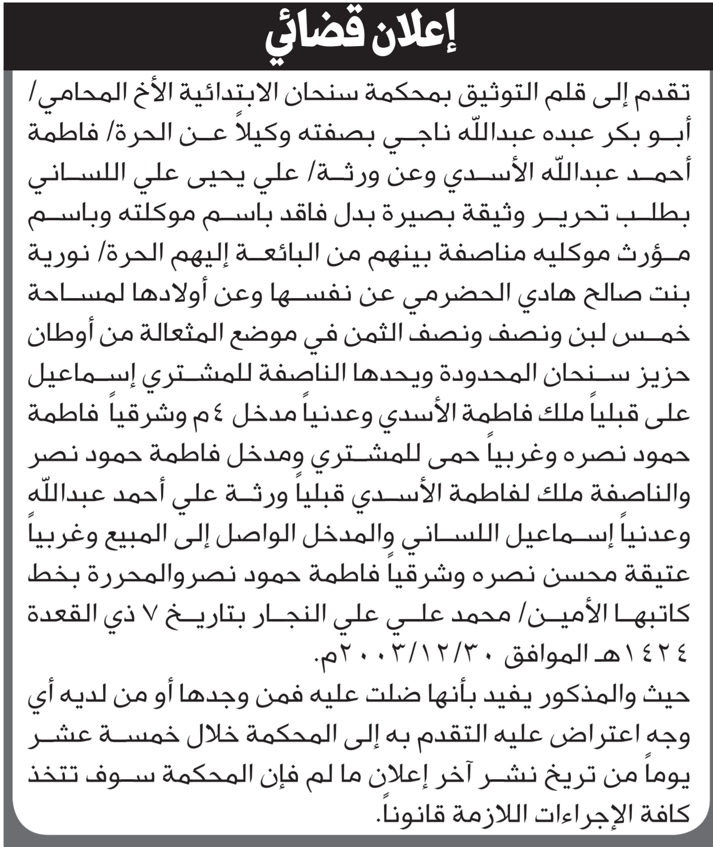 تعلن محكمة سنحان أن الوكيل أبوبكر الأسدي تقدم بطلب تحرير بصيرة بدل فاقد إعلاناتمحاكم On ديسمبر 15, 2025 Share Share FacebookTwitterWhatsAppTelegramGoogle+البريد الإلكترونيPrint