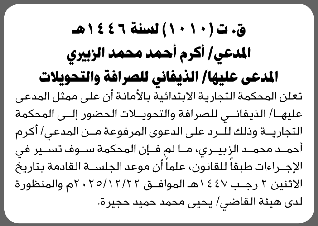 تعلن المحكمة التجارية بالأمانة أن على ممثل المدعى عليها الذيفاني للصرافة الحضور إلى المحكمة إعلاناتمحاكم On ديسمبر 16, 2025 Share Share FacebookTwitterWhatsAppTelegramGoogle+البريد الإلكترونيPrint