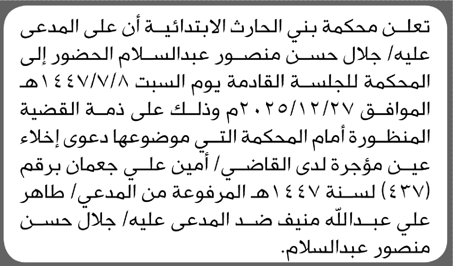 تعلن محكمة بني الحارث أن على المدعى عليه جلال حسن منصور الحضور إلى المحكمة إعلاناتمحاكم On ديسمبر 16, 2025 Share Share FacebookTwitterWhatsAppTelegramGoogle+البريد الإلكترونيPrint