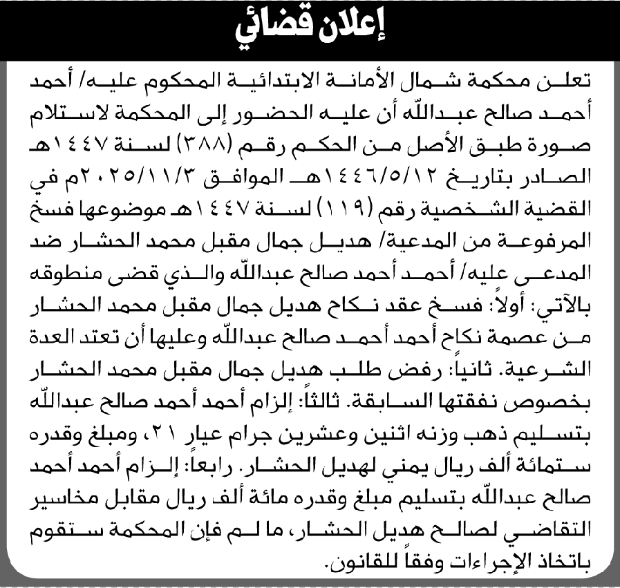 تعلن محكمة شمال الأمانة أن على المحكوم عليه أحمد أحمد صالح الحضور إلى المحكمة إعلاناتمحاكم On ديسمبر 16, 2025 Share Share FacebookTwitterWhatsAppTelegramGoogle+البريد الإلكترونيPrint