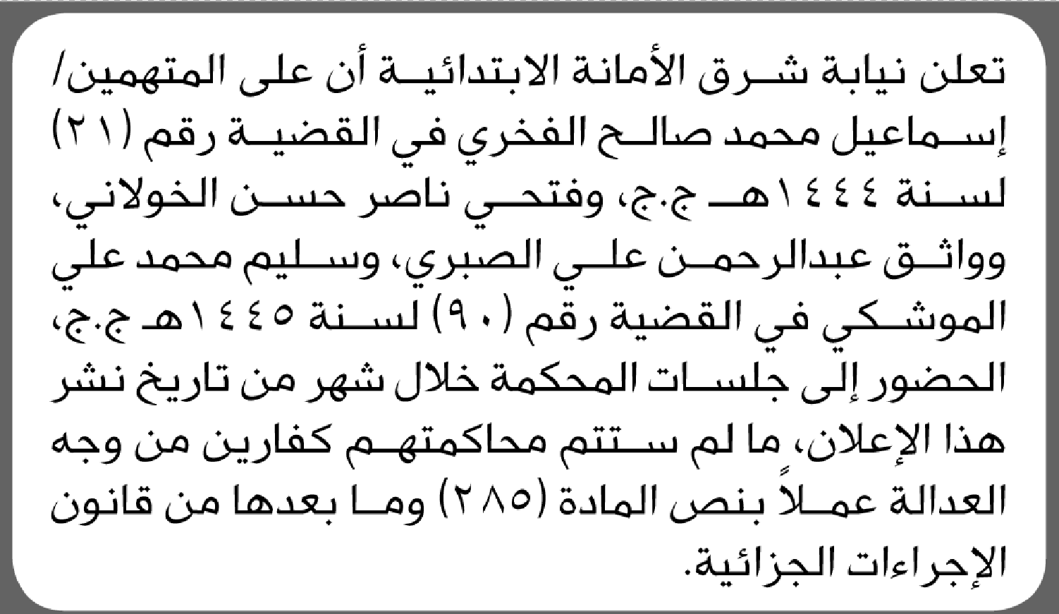 تعلن نيابة شرق الأمانة أن على المتهمين إسماعيل الفخري وآخرين الحضور إلى المحكمة إعلاناتمحاكم On ديسمبر 16, 2025 Share Share FacebookTwitterWhatsAppTelegramGoogle+البريد الإلكترونيPrint