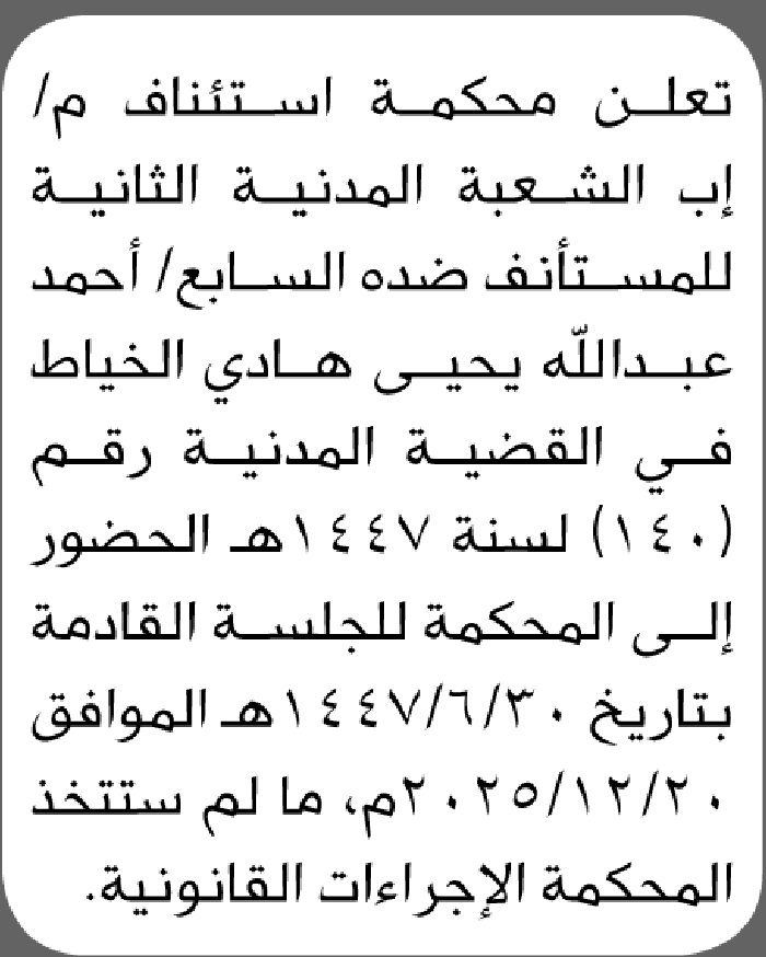 تعلن محكمة إستئناف إب أن على المستأنف ضده أحمد الخياط الحضور الى المحكمة إعلاناتمحاكم On ديسمبر 16, 2025 Share Share FacebookTwitterWhatsAppTelegramGoogle+البريد الإلكترونيPrint