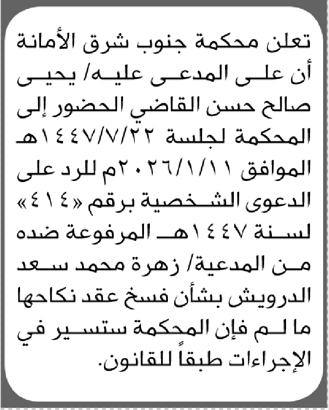تعلن محكمة جنوب شرق الأمانة أن على المدعى عليه يحيى القاضي الحضور الى المحكمة إعلاناتمحاكم On ديسمبر 17, 2025 Share Share FacebookTwitterWhatsAppTelegramGoogle+البريد الإلكترونيPrint