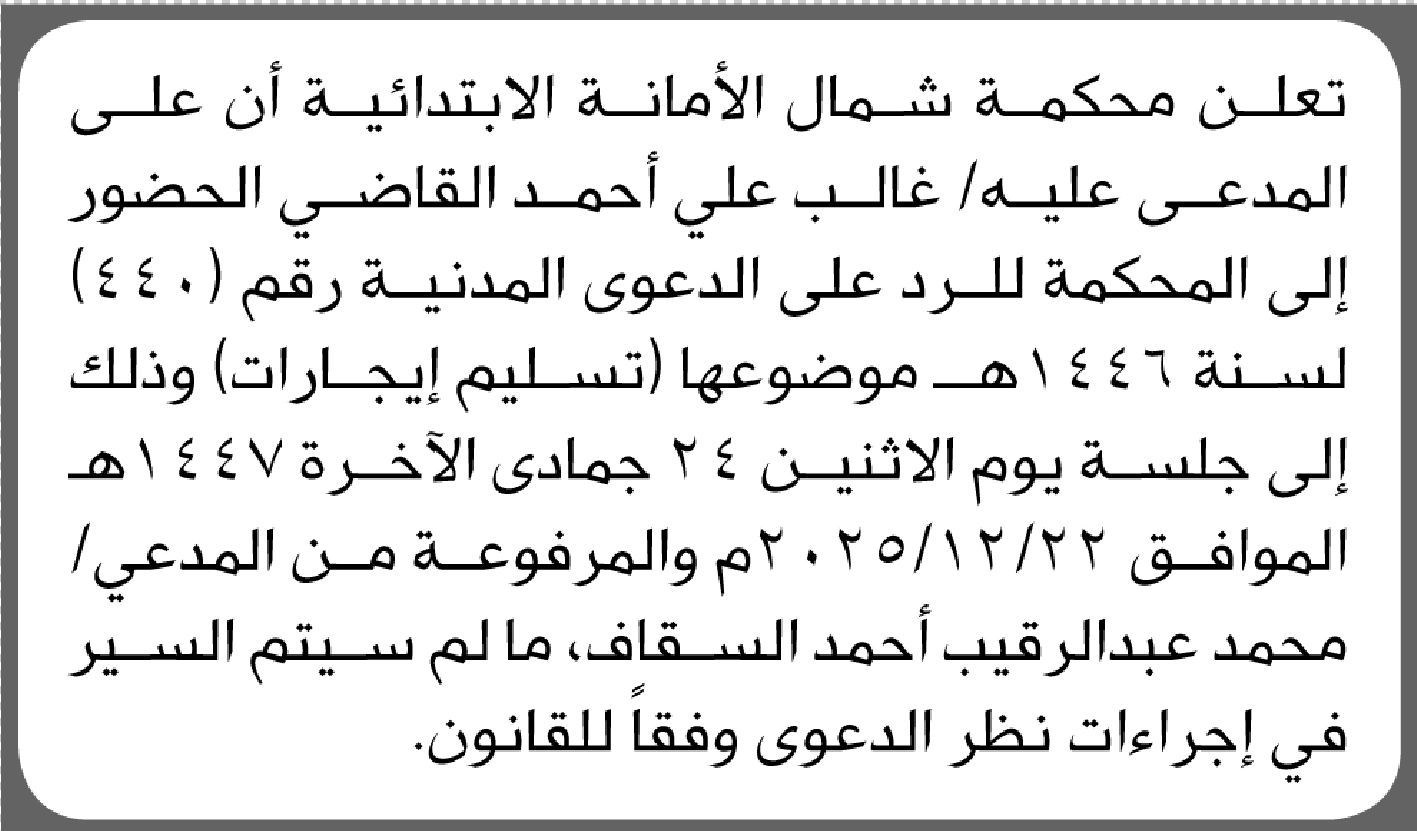 تعلن محكمة شمال الأمانة أن على المدعى عليه غالب علي القاضي الحضور إلى المحكمة إعلاناتمحاكم On ديسمبر 17, 2025 Share Share FacebookTwitterWhatsAppTelegramGoogle+البريد الإلكترونيPrint