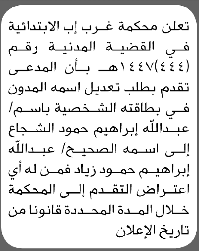تعلن محكمة غرب إب الابتدائية بأن الأخ/ عبدالله إبراهيم الشجاع تقدم إليها بطلب تعديل اسمه إعلاناتمحاكم On ديسمبر 17, 2025 Share Share FacebookTwitterWhatsAppTelegramGoogle+البريد الإلكترونيPrint
