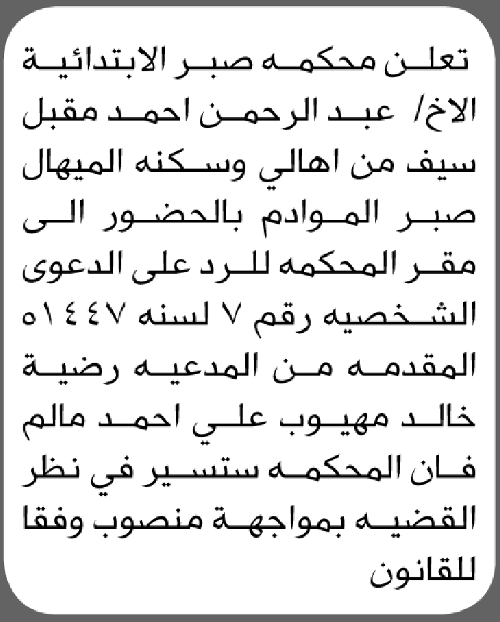 تعلن محكمة صبر الابتدائية بأن على/ عبدالرحمن أحمد سيف الحضور إلى المحكمة إعلاناتمحاكم On ديسمبر 17, 2025 Share Share FacebookTwitterWhatsAppTelegramGoogle+البريد الإلكترونيPrint