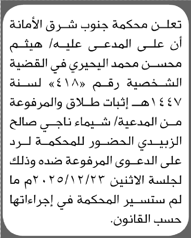 تعلن محكمة جنوب شرق الأمانة بأن على/ هيثم محسن اليحيري الحضور إلى المحكمة إعلاناتمحاكم On ديسمبر 17, 2025 Share Share FacebookTwitterWhatsAppTelegramGoogle+البريد الإلكترونيPrint
