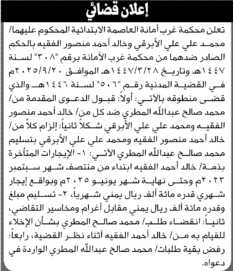 تعلن محكمة غرب الأمانة بأن على/ محمد الأبرقي وخالد الفقية تنفيذ منطوق الحكم إعلاناتمحاكم On ديسمبر 18, 2025 Share Share FacebookTwitterWhatsAppTelegramGoogle+البريد الإلكترونيPrint