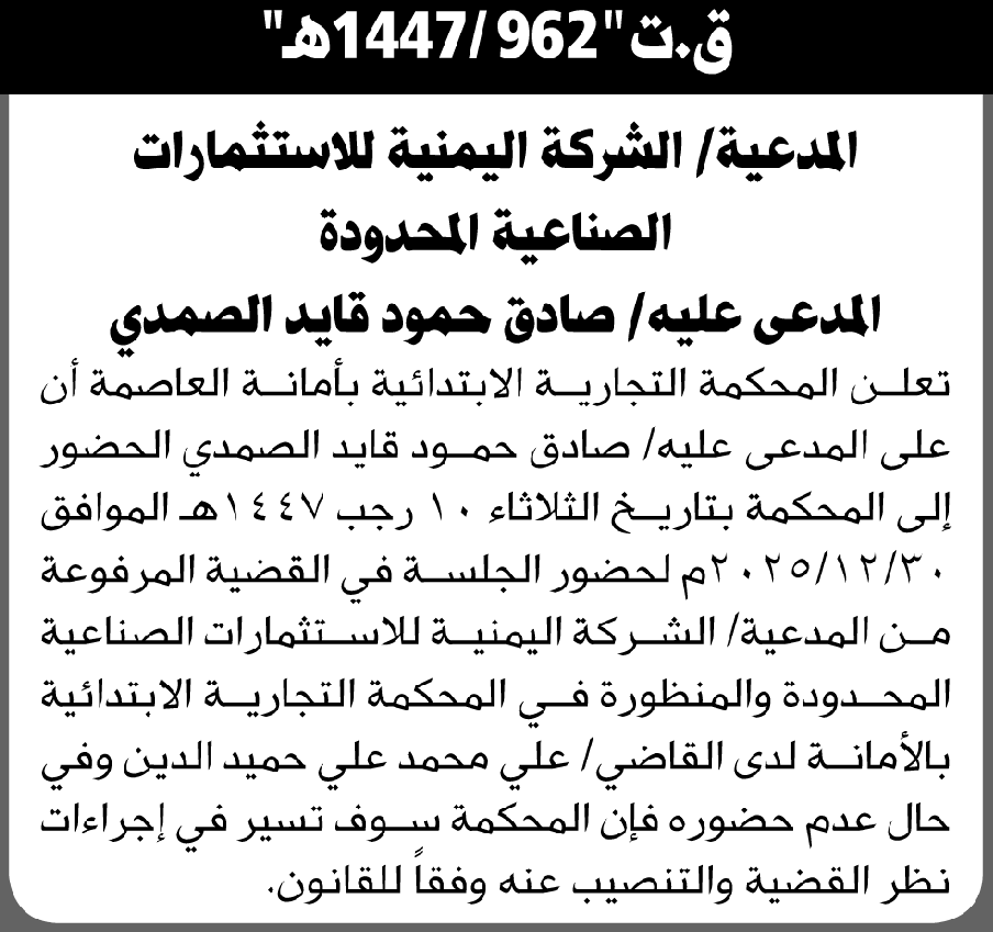 تعلن المحكمة التجارية بالأمانة أن على المدعى عليه صادق الصمدي الحضور إلى المحكمة إعلاناتمحاكم On ديسمبر 18, 2025 Share Share FacebookTwitterWhatsAppTelegramGoogle+البريد الإلكترونيPrint