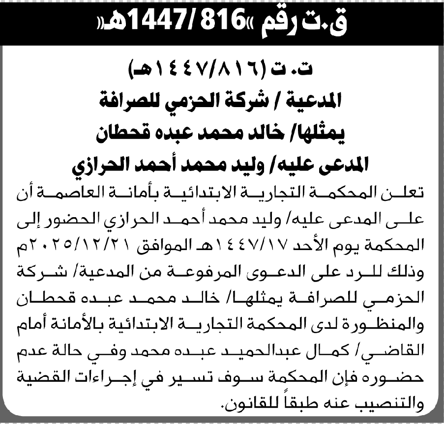 تعلن المحكمة التجارية بالأمانة أن على المدعى عليه وليد الحرازي الحضور إلى المحكمة إعلاناتمحاكم On ديسمبر 18, 2025 Share Share FacebookTwitterWhatsAppTelegramGoogle+البريد الإلكترونيPrint