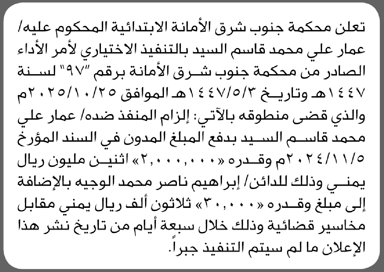 تعلن محكمة جنوب شرق الأمانة للمحكوم عليه عمار علي السيد بالتنفيذ الاختياري للحكم رقم 97 إعلاناتمحاكم On ديسمبر 18, 2025 Share Share FacebookTwitterWhatsAppTelegramGoogle+البريد الإلكترونيPrint