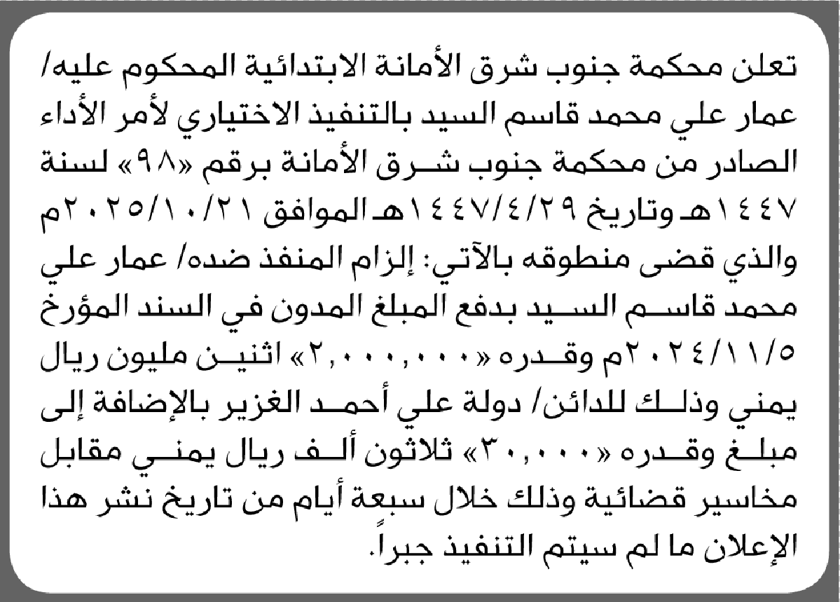 تعلن محكمة جنوب شرق الأمانة للمحكوم عليه عمار علي السيد بالتنفيذ الاختياري للحكم رقم 98 إعلاناتمحاكم On ديسمبر 18, 2025 Share Share FacebookTwitterWhatsAppTelegramGoogle+البريد الإلكترونيPrint
