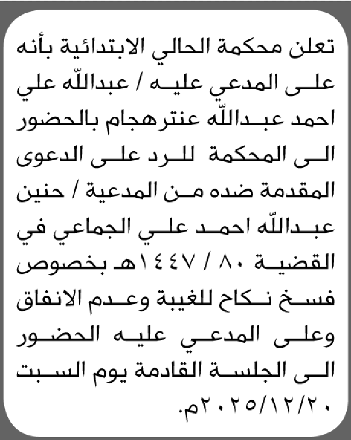 تعلن محكمة الحالي بأن على المدعى عليه عبدالله هجام الحضور الى المحكمة إعلاناتمحاكم On ديسمبر 19, 2025 Share Share FacebookTwitterWhatsAppTelegramGoogle+البريد الإلكترونيPrint