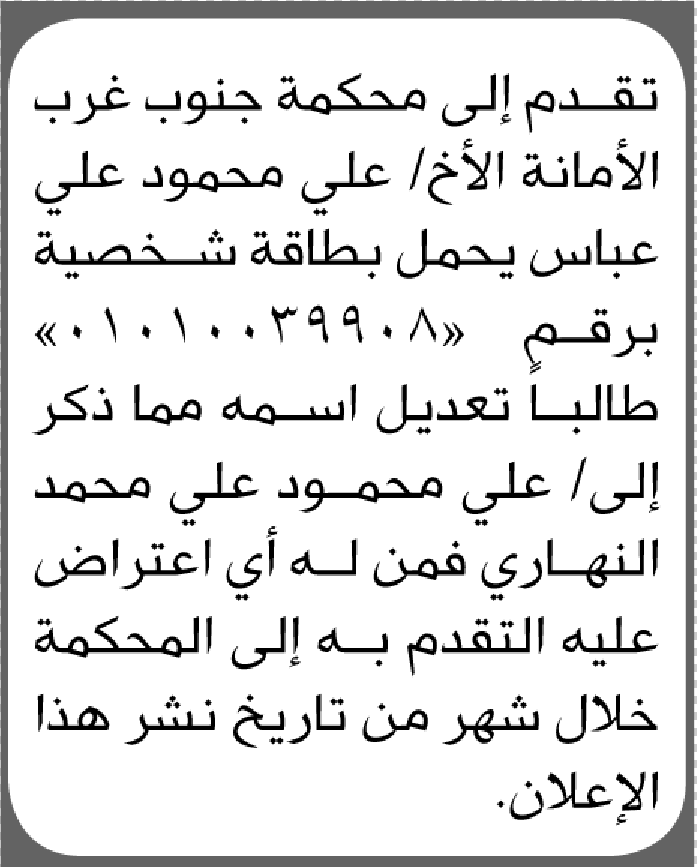 تقدم الى محكمة جنوب غرب الأمانة علي عباس بطلب تعديل بطاقة إعلاناتمحاكم On ديسمبر 19, 2025 Share Share FacebookTwitterWhatsAppTelegramGoogle+البريد الإلكترونيPrint