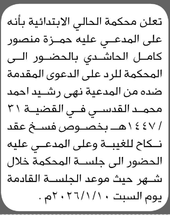 تعلن محكمة الحالي بأن على المدعى عليه حمزة الحاشدي الحضور الى المحكمة إعلاناتمحاكم On ديسمبر 19, 2025 Share Share FacebookTwitterWhatsAppTelegramGoogle+البريد الإلكترونيPrint
