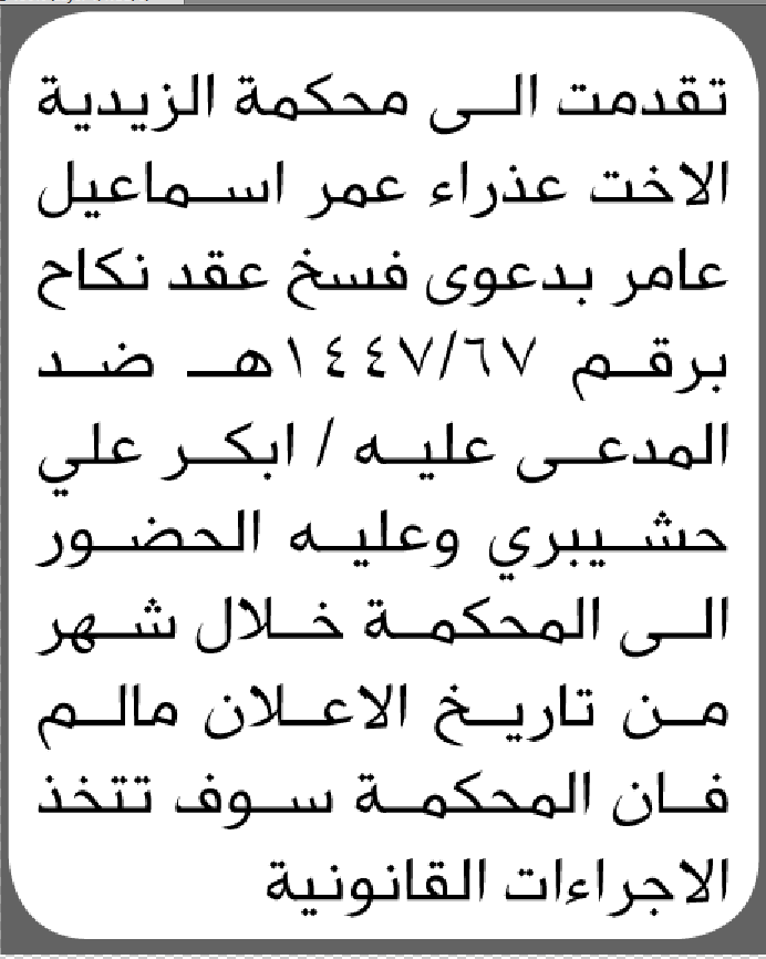 تعلن محكمة الزيدية أن على المدعى عليه أبكر علي حشيبري الحضور إلى المحكمة إعلاناتمحاكم On ديسمبر 19, 2025 Share Share FacebookTwitterWhatsAppTelegramGoogle+البريد الإلكترونيPrint