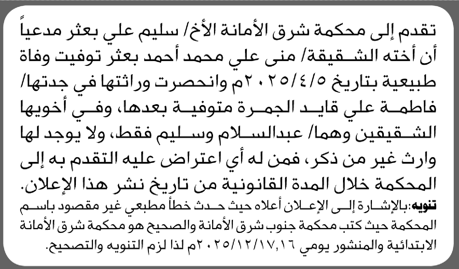 تعلن محكمة شرق الأمانة أن الأخ سليم علي بعثر تقدم بدعوى انحصار وراثة إعلاناتمحاكم On ديسمبر 19, 2025 Share Share FacebookTwitterWhatsAppTelegramGoogle+البريد الإلكترونيPrint