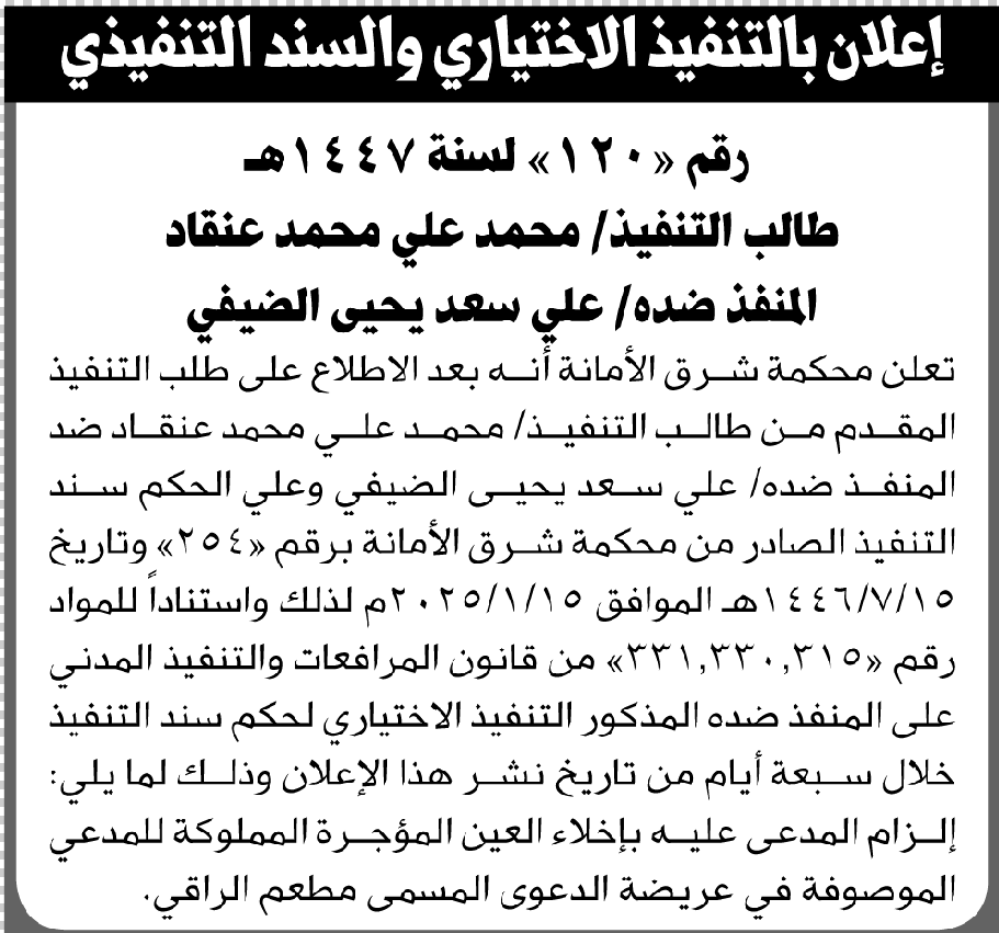 تعلن محكمة شرق الأمانة أن على المنفذ ضده علي سعد الضيفي التنفيذ الاختياري للحكم إعلاناتمحاكم On ديسمبر 19, 2025 Share Share FacebookTwitterWhatsAppTelegramGoogle+البريد الإلكترونيPrint