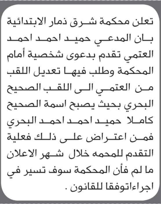 تعلن محكمة شرق ذمار بأن المدعي حميد العتمي تقدم بطلب تصحيح اسم إعلاناتمحاكم On ديسمبر 20, 2025 Share Share FacebookTwitterWhatsAppTelegramGoogle+البريد الإلكترونيPrint