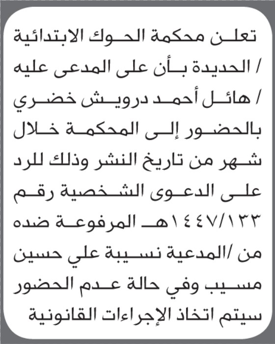 تعلن محكمة الحوك م/الحديده بأن على المدعى عليه هائل خضري الحضور الى المحكمة إعلاناتمحاكم On ديسمبر 20, 2025 Share Share FacebookTwitterWhatsAppTelegramGoogle+البريد الإلكترونيPrint