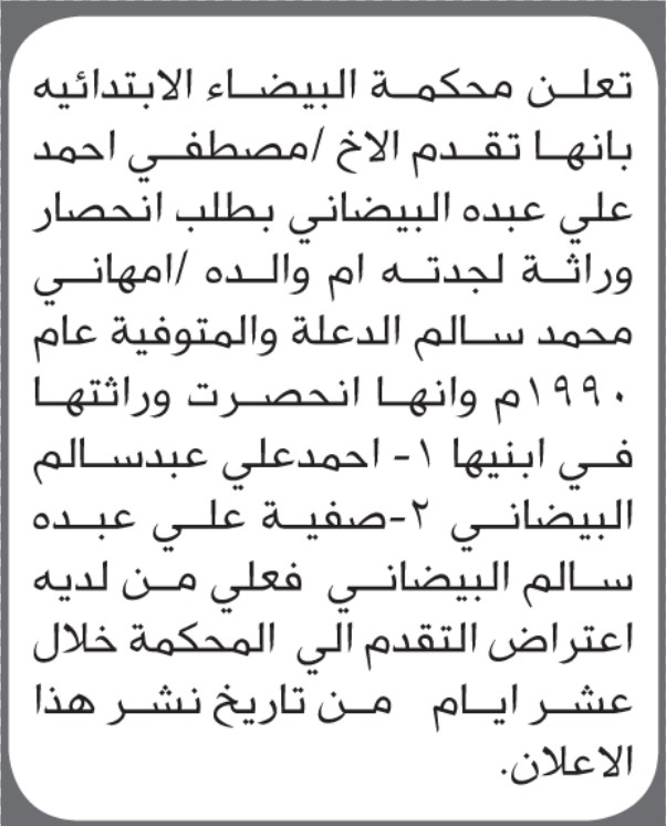 تعلن محكمة البيضاء أن الأخ مصطفى أحمد البيضاني تقدم بدعوى انحصار وراثة إعلاناتمحاكم On ديسمبر 21, 2025 Share Share FacebookTwitterWhatsAppTelegramGoogle+البريد الإلكترونيPrint