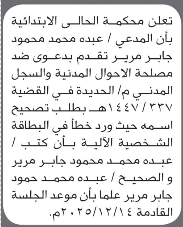 تعلن محكمة الحالي أن الأخ عبده محمد مرير تقدم بطلب تصحيح اسمه إعلاناتمحاكم On ديسمبر 21, 2025 Share Share FacebookTwitterWhatsAppTelegramGoogle+البريد الإلكترونيPrint