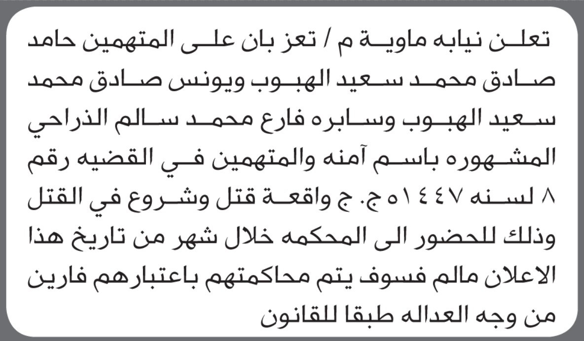 تعلن نيابة ماوية م/تعز بأن على المتهمين الحضور الى المحكمة غير مصنف On ديسمبر 21, 2025 Share Share FacebookTwitterWhatsAppTelegramGoogle+البريد الإلكترونيPrint