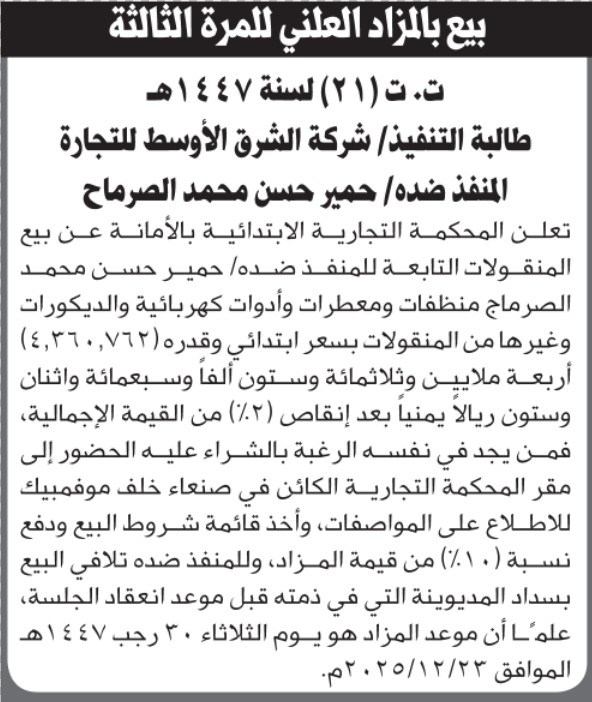 تعلن المحكمة التجارية الابتدائية عن بيع بالمزاد العلني لمنقولات المنفذ ضده/ حمير حسن الصرماح إعلاناتمناقصات On ديسمبر 21, 2025 Share Share FacebookTwitterWhatsAppTelegramGoogle+البريد الإلكترونيPrint