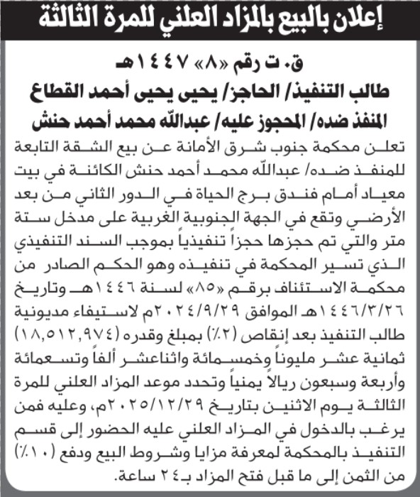 تعلن محكمة جنوب شرق الأمانة عن بيع بالمزاد العلني لعقار المنفذ ضده/ عبدالله محمد حنش إعلاناتمناقصات On ديسمبر 21, 2025 Share Share FacebookTwitterWhatsAppTelegramGoogle+البريد الإلكترونيPrint