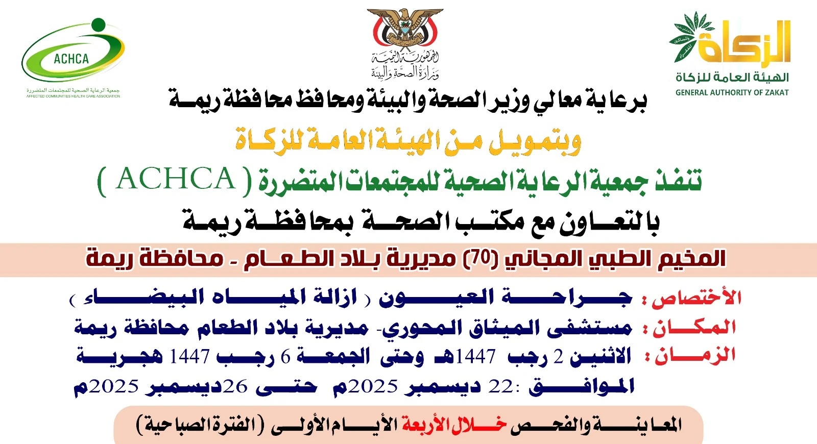 يقام المخيم في مستشفى الميثاق المحوري خلال الفترة من 2- 6 رجب، بتمويل من الهيئة العامة للزكاة وبالتنسيق مع وزارة الصحة والبيئة ومكتبها في المحافظة.